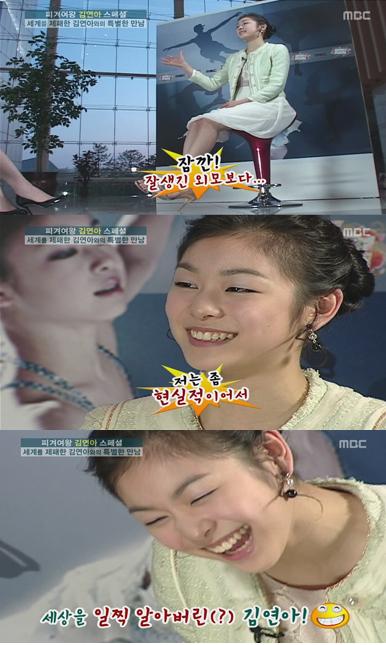 이어 MC들은 김연아에게 “마린보이 박태환은 어떠냐”며 현실속 이상형을 물었고 김연아는 “잘생기고 그런 건 중요하지 않다. 나는 좀 현실적”이라며 웃음을 선사했다.