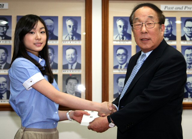 박용성 대한체육회장이 29일 대한체육회에서 `피겨 여왕' 김연아(19.고려대)에게 격려금을 전달하고 있다.