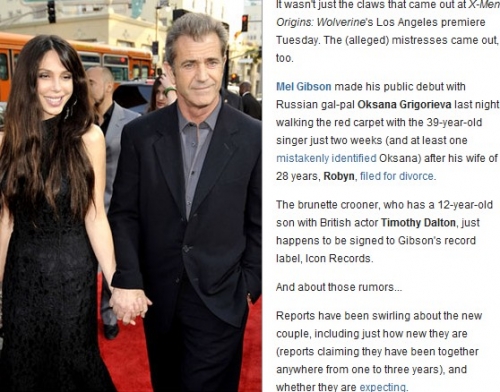 외신은 멜 깁슨이 28일 밤(현지시간) LA에서 열린 영화 '엑스맨 탄생: 울버린 (X-Men Origins: Wolverine)' 시사회에 새 여자친구 옥사나 그리고리에바(39)와 동반 참석했다고 보도했다.
