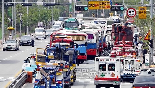 5t 트럭이 신호 대기 중이던 관광버스와 승용차를 들이 받는 등 11중 추돌사고가 발생, 1명이 숨지고 51명이 부상을 입었다.