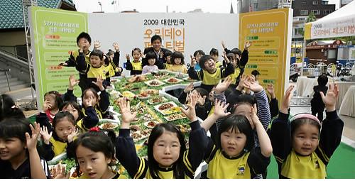 30일 서울 신촌역 광장에서 농협이 오리데이(5월2일)를 앞두고 개최한 '오리데이 페스티발'에서 행사장을 찾은 인근 유치원생들이 한반도 모형위에 전시된 팔도 오리고기 요리를 구경하면서 신기해했다.