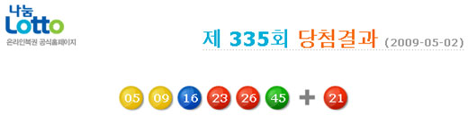 나눔로또는 2일 제335회차 로또복권 추첨 결과 당첨번호 6개로 9, 16, 5, 26, 23, 45번이며 2등 보너스 번호는 21번이다.