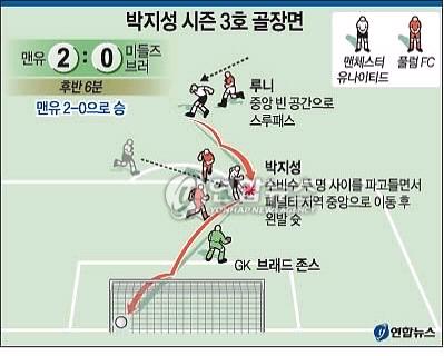 미드필드에서 볼을 잡은 웨인루니는 오른쪽 측면에서 페널티지역 중앙으로 파고드는 박지성에게 패스했고, 박지성은 수비수 두 명 사이로 곧바로 왼발슛을 날려 미들즈브러 골대 오르쪽 구석을 꿰뚫었다.