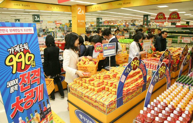 URL복사 기사공유하기 스크랩 프린트 메일보내기 글씨키우기 0 '무조건 990원~골라 골라"신세계 이마트는 신선식품, 가공식품, 생활용품, 가정용품 등 500여종의 상품을 990원에 판매하는 `990원 상품' 행사를 개최, 7일 이마트 성수점을 찾은 고객들이 상품을 고르고 있다. (사진=연합뉴스) 저작권자 © 소비자가 만드는 신문 무단전재 및 재배포 금지 유성용 기자 다른기사 보기 URL복사 기사공유하기 주요기사 ‘소비자 보호’ 사라진 금감원 금융소비자보호처...앙꼬 없는 찐빵? 시중은행, 지점 158곳 줄이고 출장소 74곳 늘려... 내점 고객 줄면서 몸집 축소 10대 건설사 엇갈린 분양 전략…삼성·대우 ‘선별공급’, DL이앤씨 ‘물량확대’ 위기의 백화점 생존전략...롯데-핵심 점포, 신세계-명품·미식으로 승부 '밥솥 명가' 엇갈리는 마케팅 전략…쿠쿠-탈밥솥·제품 다각화, 쿠첸-밥솥 강화 집중 [따뜻한 경영] 현대모비스 ‘주니어 공학교실’로 과학 인재 육성