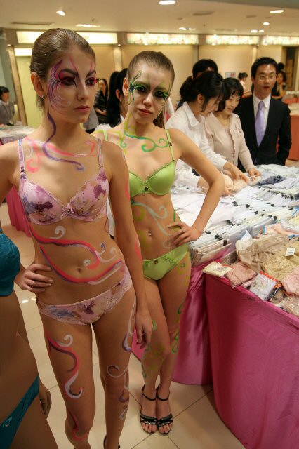 7일 오전 서울 중구 소공동 롯데백화점 본점 '월드 란제리 페스티벌' 행사장에서 보디페인팅을 한 모델들이 라이브 퍼포먼스 쇼를 하고 있다.