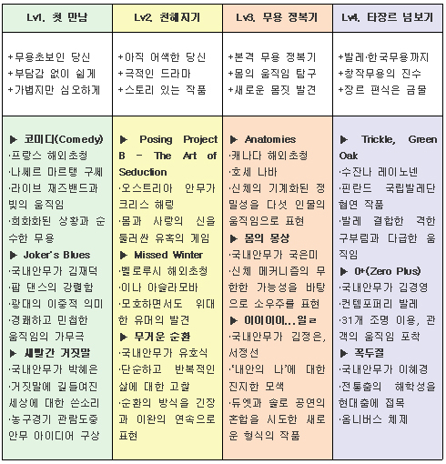 기대를 모으고 있는 해외초청부문에는 안무가 ‘나쎄르 마르탱-구쎄’의 작품 ‘코미디(Comedy)’를 비롯해 캐나다, 오스트리아 등 총 5개 팀이 선정됐다. 국내초청부문에서는 현대무용 장르에 한정되었던 작품공모를 모든 무용창작물로 범위를 넓혔다. 선정된 10개 국내 팀의 공연에는 안무가들의 신작들이 다수 포함되어 있어 그 기대가 크다.