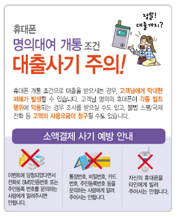 녹색소비자연대 관계자는 "담보나 신용등급에 상관 없이 쉽게 돈을 빌려준다는 이유로, 혹은 소정의 수수료를 받을 수있다는 생각에 일부 소비자들이 명의대여 유혹에 빠지게 되는 경우가 있다"며 "남의 명의를 빌려 한탕 치고 빠지는 사기행위가 확산되고 있어 소비자들의 각별한 주의가 필요하다"고 조언했다.
