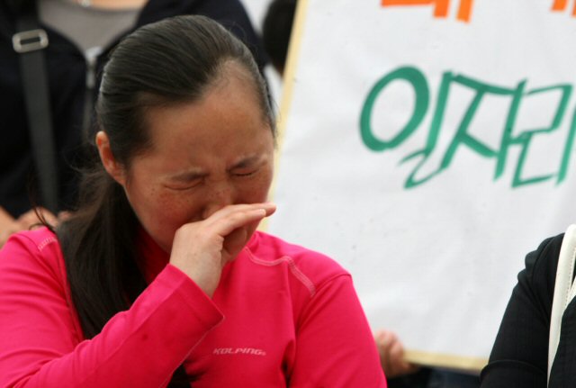 3월 해고 통보를 받은 비정규직 직원의 부인 전은숙(35) 씨는 "반년동안 월급이 안 나오는 것을 참고 꿋꿋이 버텼는데 3월에 남편이 해고됐다. 이제 돌 된 아이 분유값도 없어 살 길이 막막하다"며 흐느꼈다.