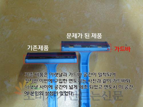 단순한 사용부주의로 보기엔 미심쩍다고 생각한 이 씨는 집에 돌아와 기존에 사용하던 면도기와 사고제품을 비교해봤다. 이 때 사고제품의 가드바와 아랫날 사이 공간이 들떠 피부조각이 끼어있는 것을 발견했다.