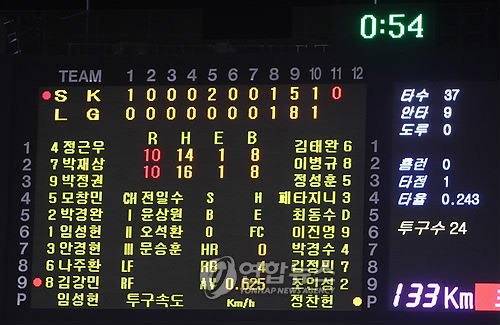 SK는 9회까지 9-1의 리드를 잡으며 경기를 쉽게 풀어나가는 듯 했다. 하지만 LG는 9회 대거 8득점을 올리며 역대 9회말 최다 득점 신기록(종전 6점) 을 기록하며 승부를 연장으로 끌고가는 저력을 발휘했다.