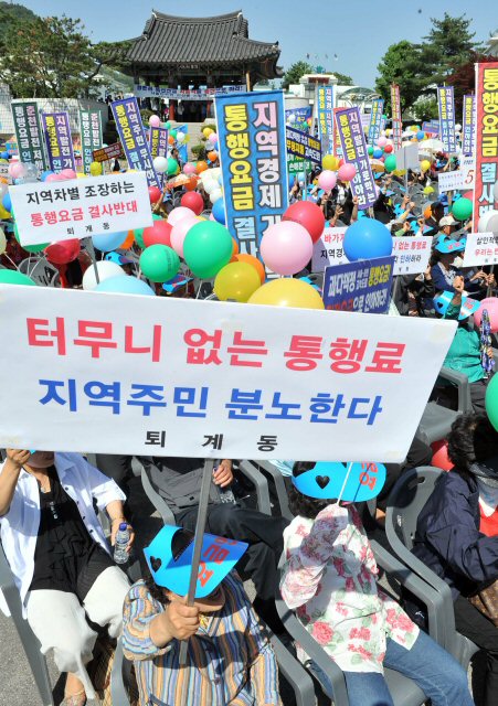 서울~춘천고속도로 통행료 인하 촉구 범시.군민추진위원회(위원장 전수산)가 주최한 이날 궐기대회에는 허천 국회의원, 이광준 춘천시장을 비롯해 홍천, 화천, 양구, 경기 가평 주민 등 1000여명이 참가했다.