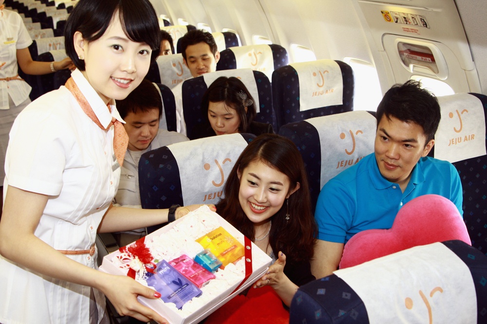 성년의 날을 맞아 제주항공 승무원이 탑승객에게 ‘에이솔루션-미니’화장품 5종 세트를 증정하고 있다.