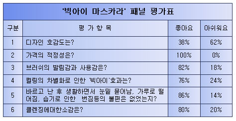 38명이 컬링효과와 또렷한 눈매연출로 빅아이 효과를 체험했다고 응답했다. 12명은 큰차이가 없다. 확연한 차별화는 못느꼈다며 중립적인 의견을 냈다.