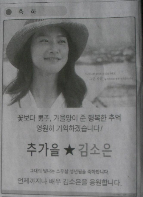 광고에서 팬들은 환한 미소의 김소은 사진과 함께 “‘꽃보다 남자’ 가을양이 준 행복한 추억 영원히 기억하겠습니다!”라며 “그대의 빛나는 스무살 성년됨을 축하합니다. 언제까지나 배우 김소은을 응원합니다”라고 감동적인 메시지를 전달했다.