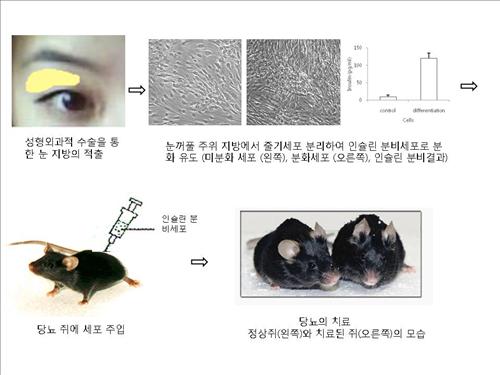 서울여대 생명공학과 김해권 교수팀은 연세대의대 이은직(내과)ㆍ김경식(외과) 교수, 건국대 임현정 교수, 인제대 강성구 교수팀과 공동으로 쌍꺼풀 수술 뒤 버리는 눈꺼풀 지방 성체줄기세포를 인슐린 분비세포로 분화해 이를 제1형 당뇨쥐에 이식한 결과 당뇨가 치료됐다고 19일 발표했다.