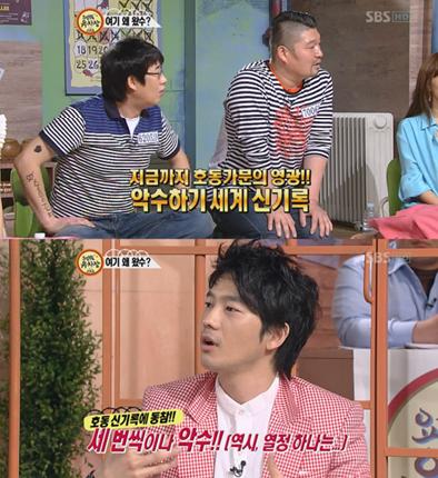 이에 강호동은 "영국 기네스 협회에서 직접 와 몇 번이고 '한번 한 사람과 다시 하면 기록이 인정 안 된다'고 강조했었다"며 놀란 가슴 쓸어내리며 특유의 호들갑을 떨었다.(사진-SBS)