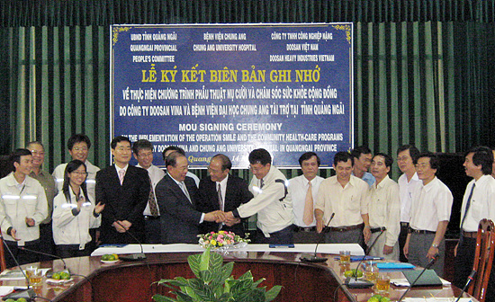 중앙대의료원은 지난 14일 두산 비나, 베트남 꽝아이성과 함께 구순구개열(언청이) 환자 무료 시술을 위한 양해각서(MOU)를 체결하고 의료봉사활동에 적극 참여하기로 합의했다.