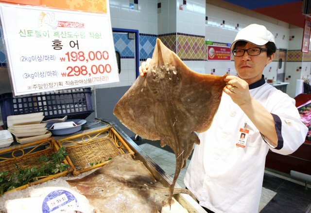 URL복사 기사공유하기 스크랩 프린트 메일보내기 글씨키우기 그랜드 마트가 20일 서울 강서구 계양점에서 귀한 국산 흑산도 홍어를 선보여 눈길을 끌고 있다. 흑산도 홍어는 톡 쏘는 맛이 일품으로 어획량이 많지 않고 현재(6월말까지)금어기간이라 산지 이외에서는 구경하기 조차 쉽지 않다. 그랜드마트는 오는 24일까지 무게 3kg 홍어를 29만8000원에 판매하고 있다. 최대 30% 할인된 가격으로 팔고 있다.(사진=연합뉴스) 저작권자 © 소비자가 만드는 신문 무단전재 및 재배포 금지 유성용 기자 다른기사 보기 URL복사 기사공유하기 주요기사 화이트 생크림 파이에서 프리미엄 디저트까지…몽쉘의 30년 변신사 GC녹십자, 지난해 매출 1조9913억 원…사상 최대 크래프톤, 주한인도대사와 기술 협력·투자 확대 논의 스텔란티스코리아, ‘2025 스텔란티스 어워드’ 개최 락앤락, 라이프스타일 브랜드 '택플로우' 론칭 애경산업, 지난해 영업이익 211억 전년比 54.8%↓…중국 시장 부진 탓