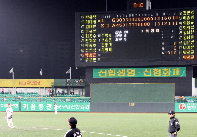 21일 광주무등경기장에서 벌어진 2009 프로야구 KIA 타이거즈와 LG 트윈스의 경기가 22일까지 이어지고 있다. 이 경기는 역대 최장시간인 5시간58분만에 13-13 무승부로 끝이 났다.
