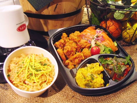 ▲도시락세트 - 연어샐러드, 볶음밥, 치킨, 단호박 펜네 샐러드. 가격 9천800원 (부가세 별도)