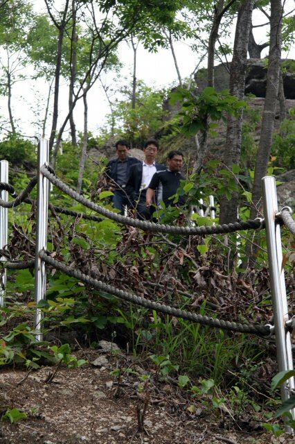23일 경찰 관계자들이 권양숙 여사 등 가족에게 비밀로 한 채 짧은 유서만을 남긴 노 전 대통령이 투신한 것으로 알려진 '부엉이 바위'에서 현장조사를 위해 이동하고 있다.