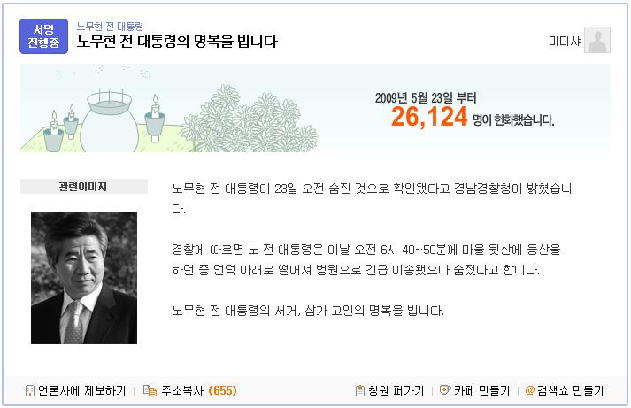 네티즌들은 “정말 답답하다” “하늘도 울고, 국민들도 울었다” “가슴이 아프다” “약한 사람으로 삶을 마감하다니 안타깝다” “이 땅에 민주주의가 가장 꽃피웠던 때로 기억될 것이다”라며 안타까운 마음을 표하며 추모했다.