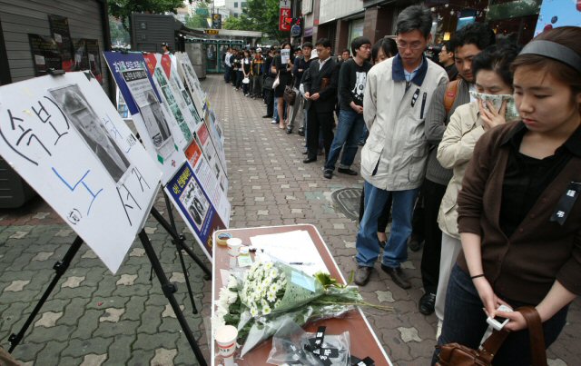 노 전 대통령 서거 소식이 전해진 이날 오전 온라인 포털사이트에는 “오후 4시 덕수궁 앞에서 모이자”는 글이 돌았고, 시민들은 가슴에 ‘근조’라 적힌 까만 리본과 하얀 국화를 손에 들고 하나 둘씩 모이기 시작했다.