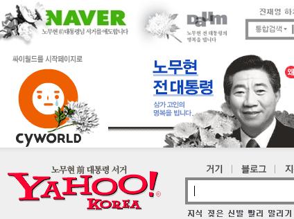 야후코리아 또한 전체적으로 회색톤의 메뉴바와 더불어 ‘YAHOO KOREA’ 로고 위에 ‘노무현 前 대통령 서거’를 덧붙였다.