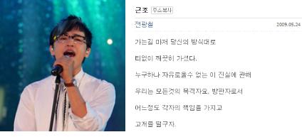 이수는 24일 미니홈피 다이어리에 '근조(謹弔)'라는 제목으로 "가는길 마저 당신의 방식대로 티없이 깨끗히 가셨다""는 시작에 이어 "누구하나 자유로울수 없는 이 진실에 관해 우리는 모든것의 목격자요, 방관자로서 어느정도 각자의 책임을 가지고 고개를 떨구자"며 안타까움을 전했다.