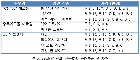 해외라이선스 뮤지컬이 대부분 대극장에서 공연된다는 사실은, 높은 티켓 가격 형성에 크게 기여하고 있다. 물론 국립극장 해오름에서 공연한 ‘뮤지컬 新 행진 와이키키’처럼, 같은 공연장에서 공연한 해외라이선스 작품보다 저렴한 경우도 있다. 하지만 2008년 뮤지컬 공연 전반을 살펴보면, 대부분의 티켓 가격은 공연장에 따라 결정되는 것으로 보인다.(표 3) 충무아트홀 대극장의 ‘헤어스프레이’와 ‘미녀는 괴로워’, LG아트센터의 ‘나인’, ‘맨 오브 라만차’, ‘지킬 앤 하이드’와 ‘화성에서 꿈꾸다’ 등이 그러하다. 즉, 해외라이선스 작품 자체로 인한 높은 가격 책정보다는, 대극장에서 공연하는 경우가 빈번하였고 이것이 해외라이선스 뮤지컬 가격 이미지 전반에 영향을 미쳤다는 것이다. 문제는, 대극장을 선택함으로써 가격 경쟁력을 잃은 해외라이선스 중 그만한 가치를 뽐내지 못한 경우이다. 2009년 라인업 된 대학로 창작 뮤지컬 ‘오, 당신이 잠든 사이’, ‘김종욱 찾기’, ‘카페인’등의 저렴함과 알뜰한 재미를 떠올려 보면, 대극장의 장점인 화려함과 웅장함을 갈고 닦지 않은 기획사들이 고배를 마실 것이라는 예상이 눈앞에 그려진다. 작품의 유명세나, 규모만 가지고 연구를 게을리 하면 안 된다는 것이다.