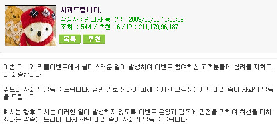 경품이 해외로 발송된데 대해서는 "실질적으로 경품이 해외로 발송된 것이 아니고 경품 담당 직원이 아이피를 해외로 변경한 것 같다. 발송할 때 까지 주소는 모두 국내였고 각 지방도 포함이 되어 있어서 정말 알 수 없었다. 이 사건으로 여러 직원들도 사표를 쓰게 될 처지여 놓였다"면서 "지금은 고객들이 답답해 하고 억울해 하는 심정을 알고 있지만, 조금만 기다려주면 빠른 시일안으로 해결책을 마련토록 노력하겠다"고 덧붙였다.