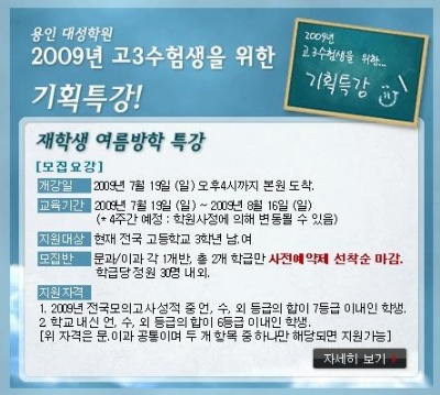 이번 용인대성학원 ‘고3 여름캠프’는 오는 7월 19일부터 8월 16일까지 4주간 진행된다. 학급당 정원은 30명 내외로 문과ㆍ이과 각 1개반씩 총 2개 학급만 사전예약제로 선착순 마감할 예정이다.