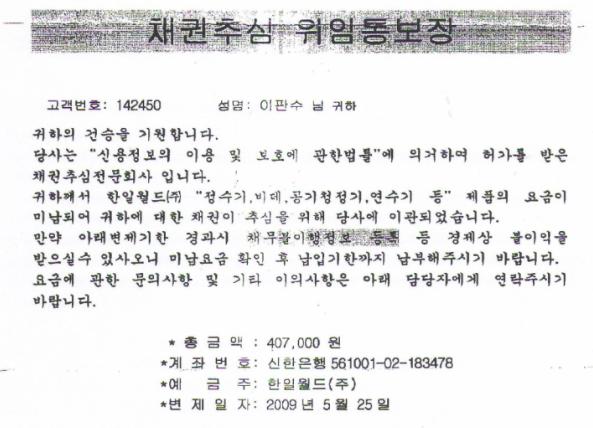 아무런 사후관리 없이 시간만 흘려보내던 업체는 지난 3월 말경 미납요금과 위약금을 포함, 40만 7천원을 청구하는 ‘채권추심 위임장’을 발부했다.