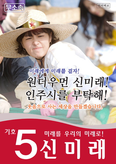특히 선거포스터를 제작하는 과정에서 유관순 누나, 원더우먼, 신사임당 등 여러 버전의 포스터를 촬영한 후 최종으로 원더우먼을 선택했다. ‘미래에게 미래를 걸자! 원더우먼 신미래! 인주시를 부탁해! 웃음으로 사는 세상을 만들겠습니다’라는 문구도 넣었다.