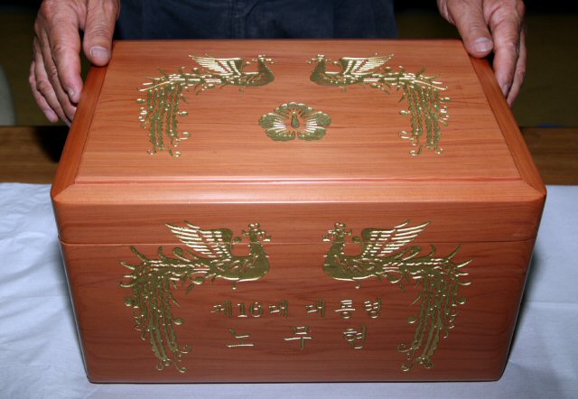 국민장으로 치러지는 고(故) 노무현 전 대통령의 장례식을 하루 앞둔 28일 경기도 고양시 유골함 전문제작업체에서 유골함이 만들어져 공개됐다. 북미산 향나무로 만든 유골함은 가로 35㎝, 세로 25㎝, 높이 20㎝, 두께 1.8㎝다.