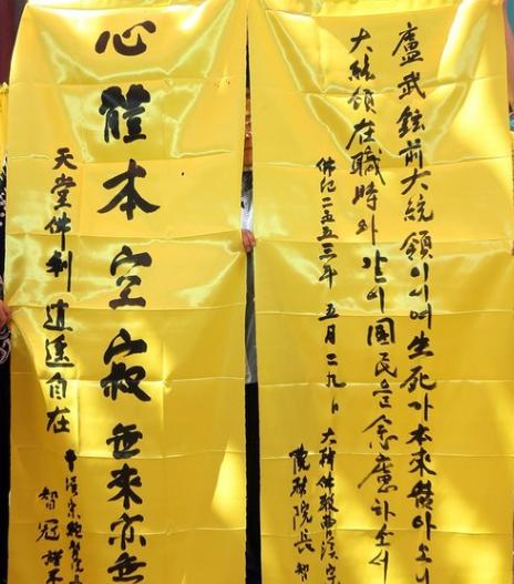 위 만장은 27일 오후 서울 조계사 대웅전 앞에서 조계종 총무원장 지관스님이 직접 쓴 것으로 조계사는 이날부터 조계종 중앙종무기관 간부 스님들과 조계사 스님들, 일반 시민 추모객 등과 함께 영결식에서 사용할 만장 2천개를 제작했다.