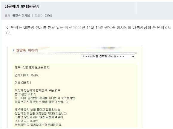 2002년 대선을 한 달 앞두고 마음고생이 심했던 남편을 응원하는 이 편지는 홀로 남은 채 떠나간 남편을 그리워하는 '망부사'(亡夫詞)가 됐다.