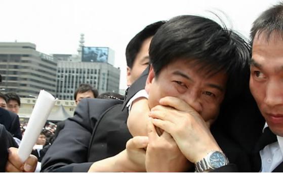 백원우 민주당 의원이 29일 경복궁 앞뜰에서 열린 故 노무현 전 대통령 영결식에서 이명박 대통령이 헌화시 "사죄하라”, “정치보복으로 노무현 전 대통령께서 돌아가셨다”라고 외치다 경호원들에게 제지당하고 있다.