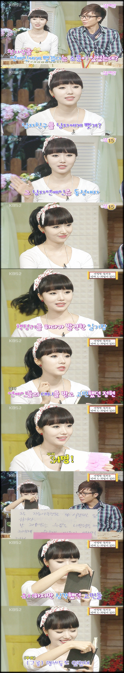 지난 30일 방송된 KBS 2TV ‘신동엽 신봉선의 샴페인’에 출연한 이정현은 남자친구를 연예인에게 빼앗겼다는 루머가 있다는 MC의 질문에 "연예인에게 남자친구를 빼앗긴 것은 맞다. 하지만 남자친구를 빼앗아간 연예인은 남자였다"라고 충격 고백을 했다.