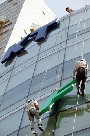 5월 31일 오전 서울 송파구 잠실 KTF 본사에서, 6월 1일 KT와의 공식 합병을 앞두고 외벽에 붙어있던 KTF에서 F자를 떼어내는 작업을 진행하고 있다.