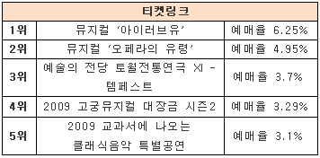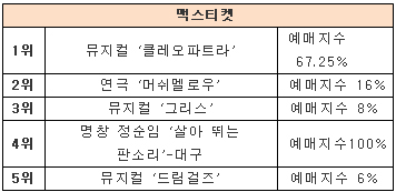 URL복사 기사공유하기 스크랩 프린트 메일보내기 글씨키우기 뮤지컬 ‘클레오파트라’가 맥스티켓의 절반이 넘는 예매율을 기록했다. 판소리와 클래식 등도 순위권에 속속 이름을 올리고 있는 가운데 인터파크의 1위부터 4위까지는 모두 뮤지컬이 차지했다. 그 중 뮤지컬 ‘시카고’가 다음달 6일 개막을 앞두고 공연부문 예매 1위를 거머쥐었다. 많은 작품들 가운데 앞으로도 관객들의 지속적인 관심이 이어질지 주목된다. [뉴스테이지=편집부] 저작권자 © 소비자가 만드는 신문 무단전재 및 재배포 금지 뉴스관리자 다른기사 보기 URL복사 기사공유하기 주요기사 아이돌 콘서트 VIP석 앉으려면 '사운드 체크' 사실상 강제…팬들 뿔 [황당무계] 21살 여대생에게 '목돈 마련용' 이라며 치매보험 팔아 연속혈당측정기 '덱스콤 G7' 기기 오류에도 환불 책임 3각 핑퐁 HD조선해양 수주 목표 초과, 한화오션 100억달러 돌파 '好好' 박현주 4.2조, 김남구 2.3조...증권주 폭등으로 오너 주식가치 '껑충' [AI시대의 그늘-AI태풍이 분다④] 은행권, AI로 피싱 잡고 대출 심사
