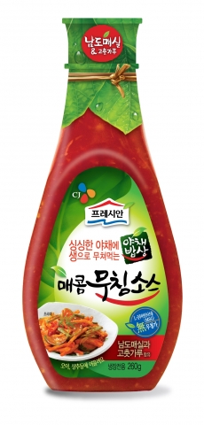 고추가루로 만든 CJ프레시안 매콤 무침소스는 매콤 새콤한 맛이 일품으로 무생채, 콩나물, 오이 등을 무치기에 좋다.