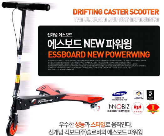 에스보드 슬로비 파워윙은 기존 킥보드의 좁은 폭과 달리 발을 올려놓을 수 있는 발판이 있어 타기 쉽고, 안정적인 자세 연출이 가능하다. 기존 킥보드가 한쪽 발을 땅바닥에 대고 추진력을 얻는 방식이라면 에스보드 파워윙은 두 발을 올라 탄 상태에서 다리의 힘만으로 앞으로 나아가는 방식이다.