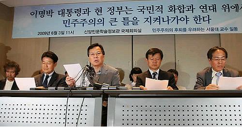 민주화를 위한 전국교수협의회에 속한 중앙대 교수 50여명도 이날 이 대통령의 사과와 내각 총사퇴 등을 요구하는 시국선언문을 발표했다.