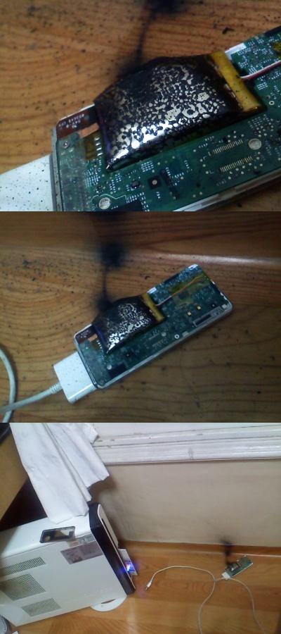 황씨는 폭발을 멈추기 위해 전원을 차단하려고 USB케이블을 제거했으나 바닥에 떨어진 아이팟에서는 연기가 한참 피어올랐고 불똥도 튀었다.