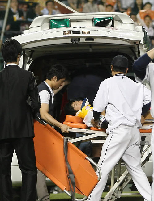 프로야구 두산-롯데 경기도중 두산의 이원석이 경기 도중 부상으로 의식을 잃고 앰뷸런스에 실려나가는 사고를 당했다.