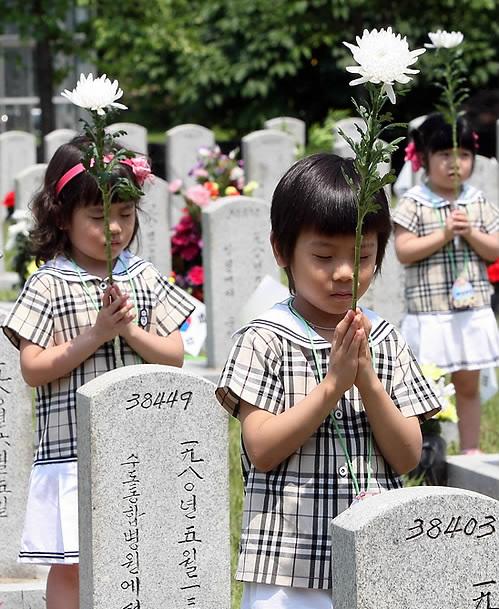 비석을 닦고 꽃을 바치며 하나같이 숙연한 표정으로 경건하게 묵념을 올리는 모습이다.