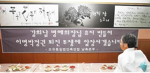 7일 오후 전북대병원 장례식장에 마련된 빈소에서 한 조문객이 고 강희남 목사가 남긴 붓글씨와 유서를 바라보고 있다.