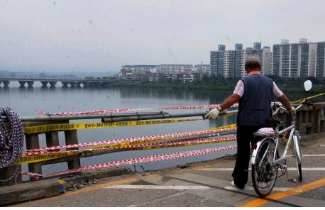 강원 춘천시 소양1교를 지나가던 한 주민이 지난 8일 오모(23) 씨가 승용차를 몰아 콘크리트 난간을 뚫고 투신한 현장을 지켜보고 있다. 소양1교는 투신자살 및 추락사고가 잇따라 ‘자살다리'라는 오명이 붙여졌다.