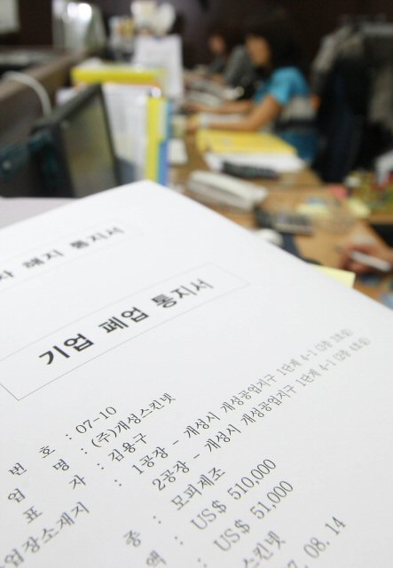 사진은 개성공단 첫 철수를 앞둔 모피가공업체 '스킨넷' 구로동 사무소에서 공개된 폐업통지서 사본. '스킨넷'은 지난 8일 개성공단관리위원회에 이 폐업통지서를 제출했다.